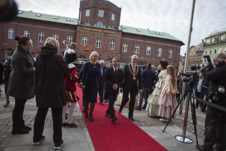 Murakami arriving at the Odense City Hall with the city mayor, Anker Boye (right), and the city and culture councillor, Jane Jegind (left)